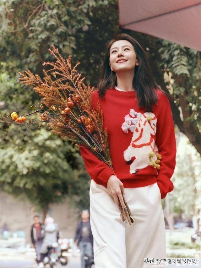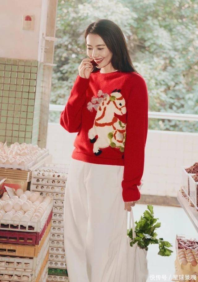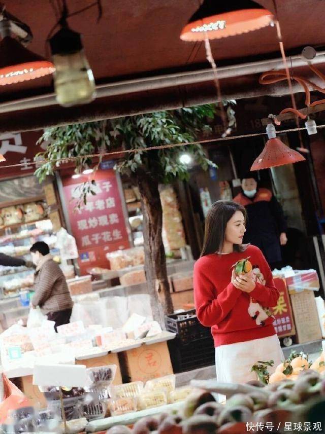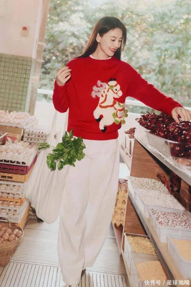 微博里提的「edition 新年红衣」,不是那种亮到刺眼的正红,看晒出的照片细节,更像揉了点豆沙调的暖红 —— 面料软软的,可能是羊毛混纺,贴在身上不紧绷,领口是简约的圆领,没有多余的水钻或刺绣,就靠利落的剪裁显气质。高圆圆穿的时候,没刻意搭华丽的配饰,就配了条浅色系的裤子,站在成都菜市场的摊位前,红衣和新鲜的青菜、红辣椒衬在一起,不违和反而特别鲜活,像街坊里那位气质好的姐姐,逛菜场也带着舒服的精致感。